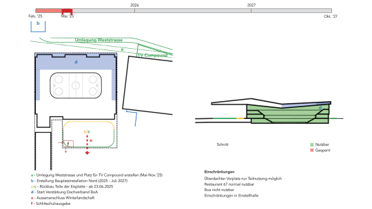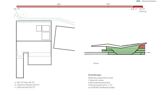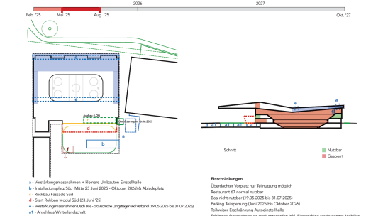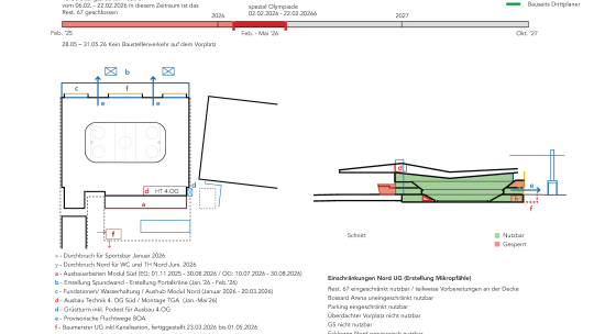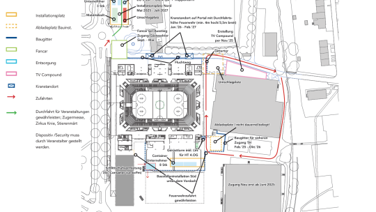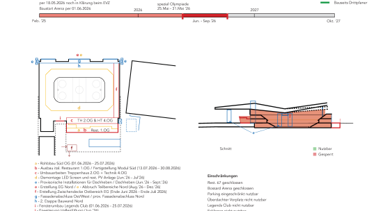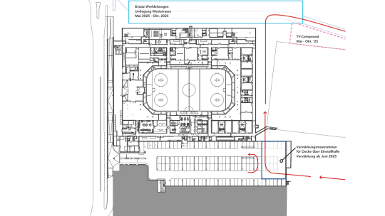 Parallel zu den Bauarbeiten im Süden starten diverse Vorbereitungsarbeiten im Innern. Dabei wird insbesondere die Dachkonstruktion verstärkt, als Vorbereitung auf die geplante Anhebung der hinteren Dachfläche im Sommer 2026. Anfang Mai haben auch die Arbeiten für die Verlegung der Weststrasse durch die Stadt Zug begonnen. Alle Arbeiten werden so geplant und ausgeführt, dass der Spielbetrieb in der Saison 2025/26 normal beginnen kann. Ab November starten erste Arbeiten am grösseren Nordvolumen, dessen Hochbau jedoch erst nach Anhebung der Dachfläche realisiert werden kann. Aufgrund der komplexen Arbeiten zur Dachanhebung im Sommer 2026 werden die ersten Heimspiele in der Saison 2026/27 erst ab Mitte Oktober möglich sein. Alle Bauarbeiten werden im Spätherbst 2027 abgeschlossen sein, so dass die Eröffnung des erweiterten Stadions noch im 60-jährigen Jubiläumsjahr des EVZ stattfinden kann.