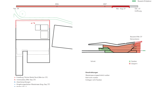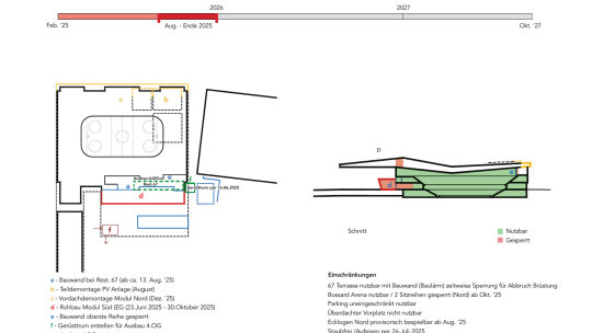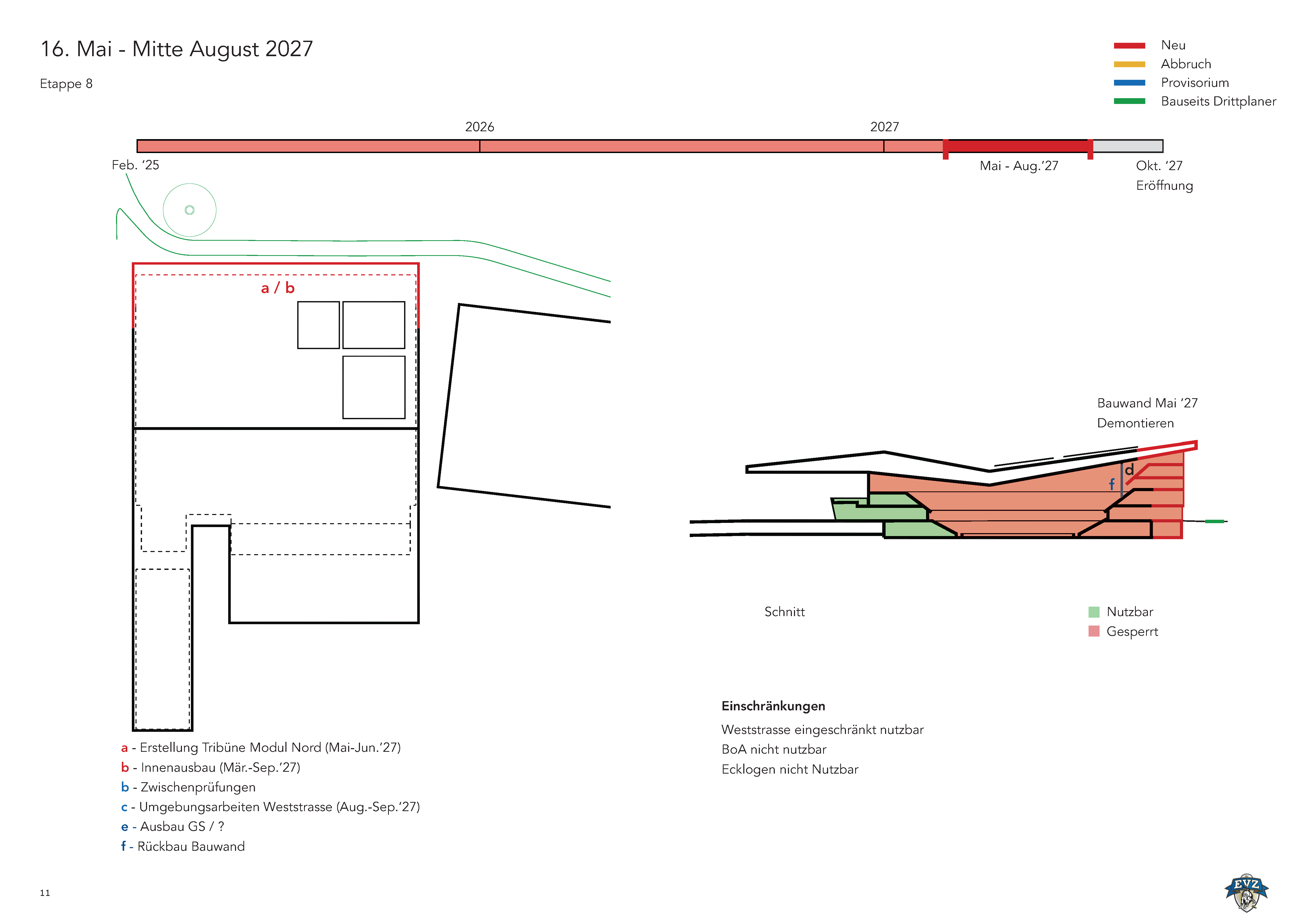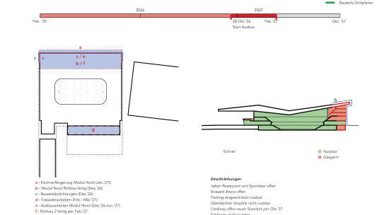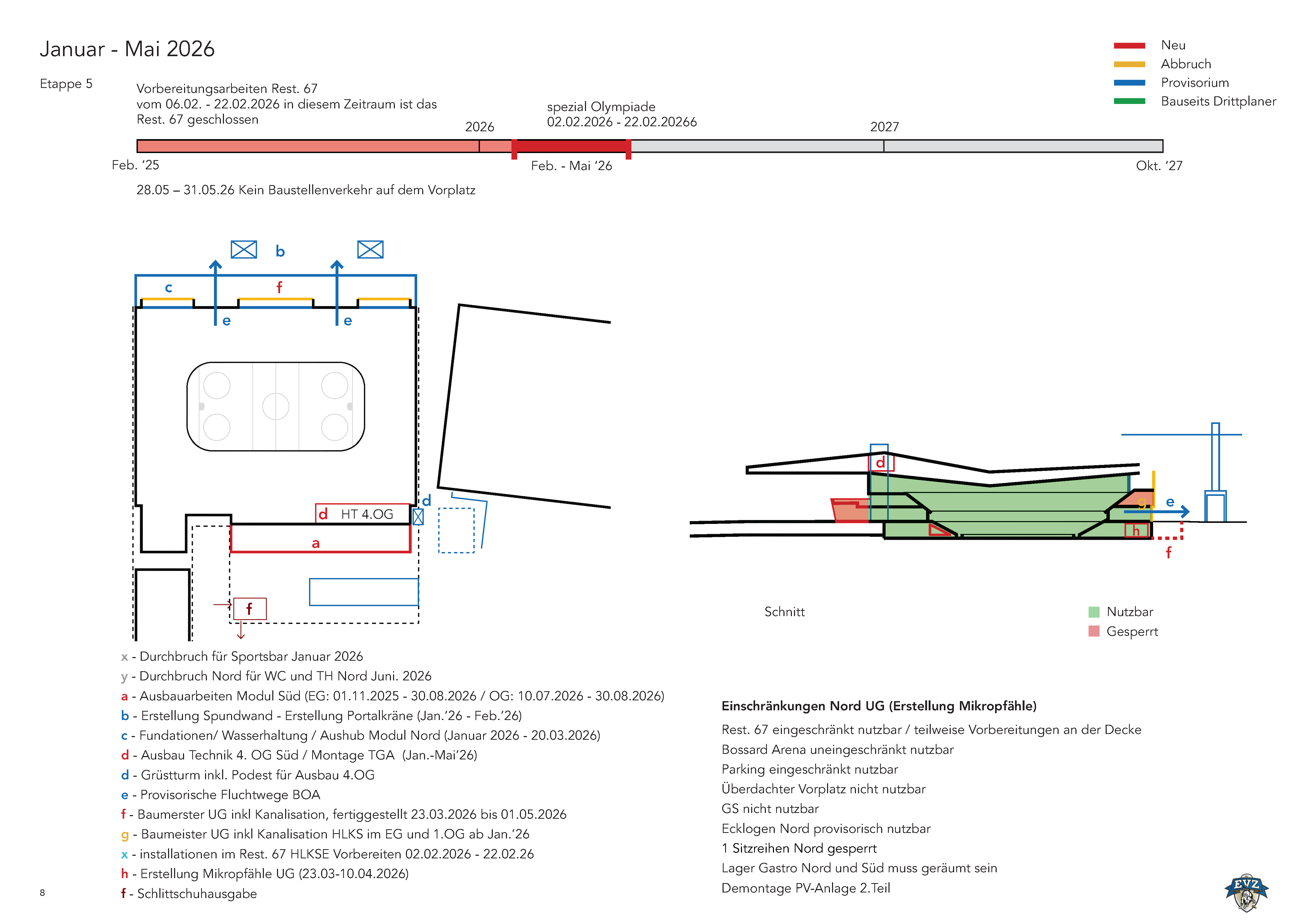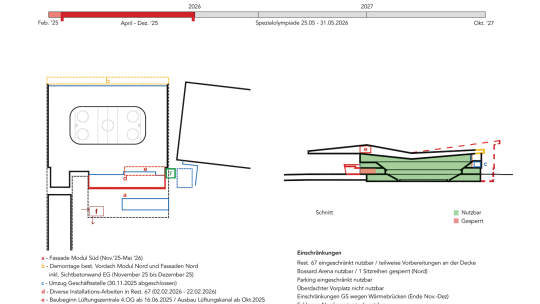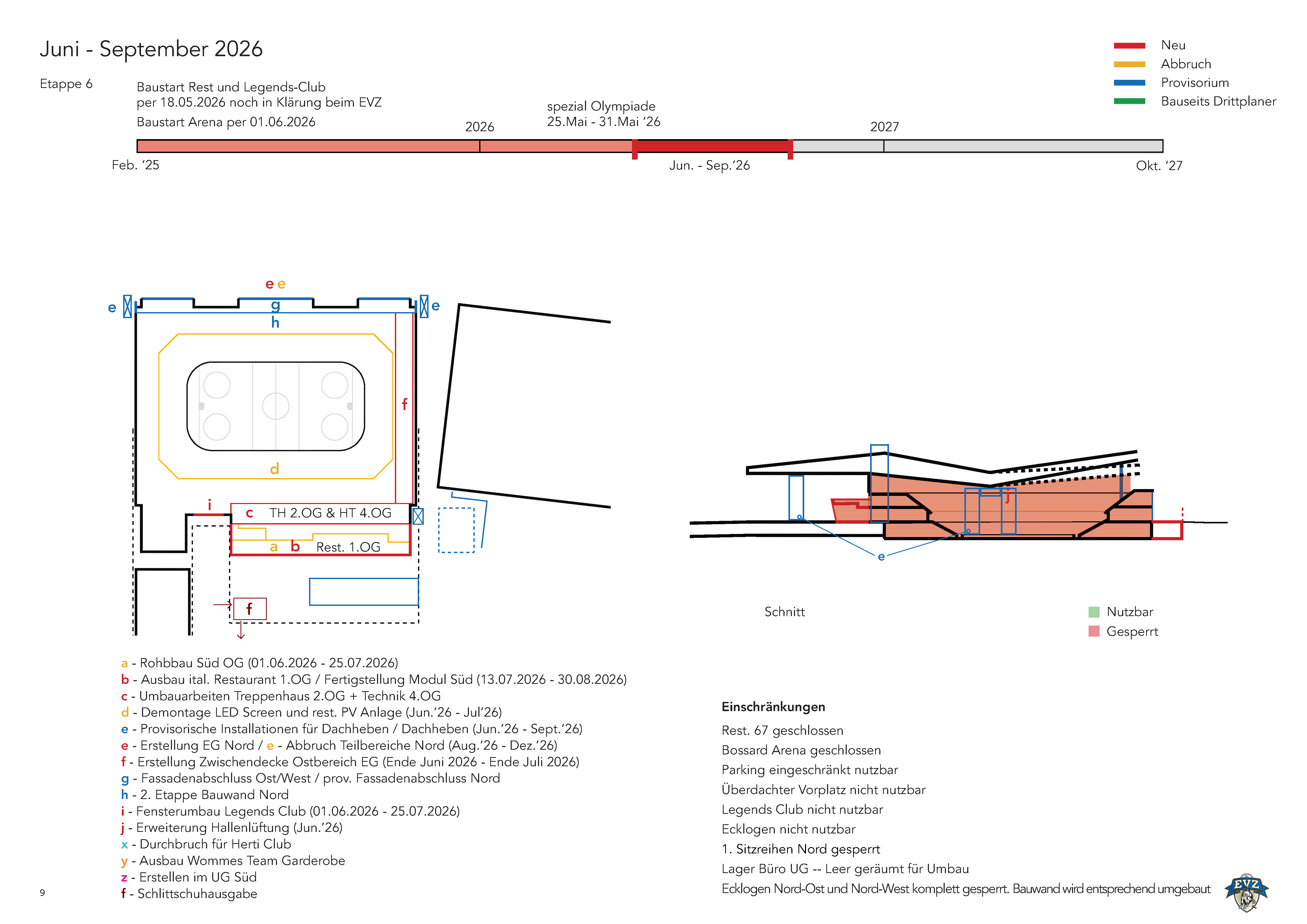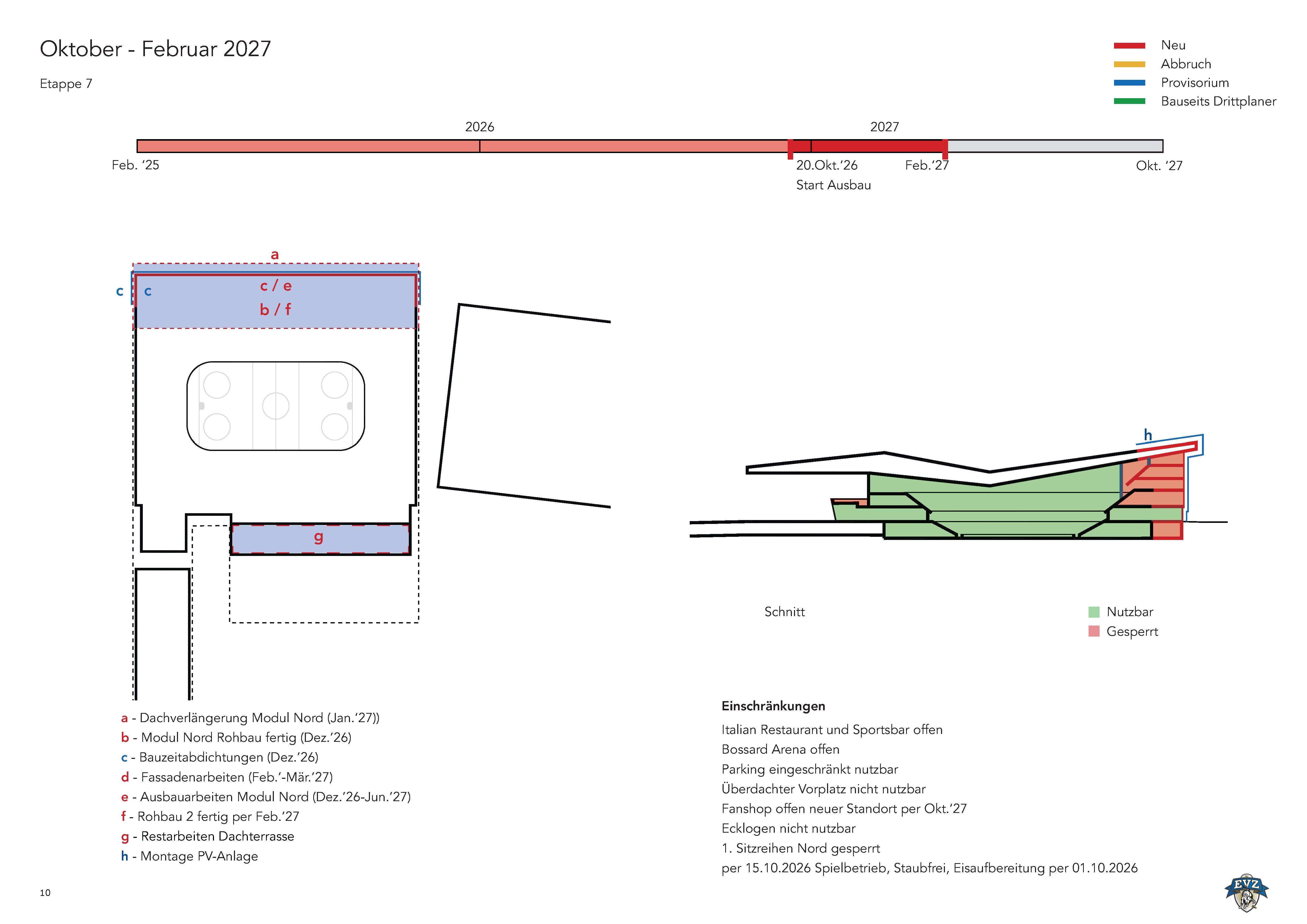 Parallel zu den Bauarbeiten im Süden starten diverse Vorbereitungsarbeiten im Innern. Dabei wird insbesondere die Dachkonstruktion verstärkt, als Vorbereitung auf die geplante Anhebung der hinteren Dachfläche im Sommer 2026. Anfang Mai haben auch die Arbeiten für die Verlegung der Weststrasse durch die Stadt Zug begonnen. Alle Arbeiten werden so geplant und ausgeführt, dass der Spielbetrieb in der Saison 2025/26 normal beginnen kann. Ab November starten erste Arbeiten am grösseren Nordvolumen, dessen Hochbau jedoch erst nach Anhebung der Dachfläche realisiert werden kann. Aufgrund der komplexen Arbeiten zur Dachanhebung im Sommer 2026 werden die ersten Heimspiele in der Saison 2026/27 erst ab Mitte Oktober möglich sein. Alle Bauarbeiten werden im Spätherbst 2027 abgeschlossen sein, so dass die Eröffnung des erweiterten Stadions noch im 60-jährigen Jubiläumsjahr des EVZ stattfinden kann.
